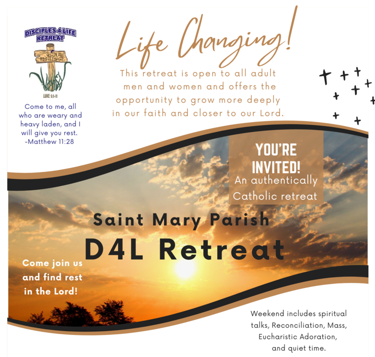 Disciples 4 Life Retreat is an adult weekend retreat open to all men and women of the Parish over the age of 18. The leaders of the retreat, which focuses on discipleship, are men and women of our Parish. It is an opportunity for you to spend some time away with God and to explore why we are called and how to live out our discipleship. The retreat is offered twice a year off site.We'll talk about... * Spirituality * Reconciliation * The Mass "It was everything that you said it would be - and more! God bless the Disciples 4 Life team for all you do to make a difference in all our lives - you certainly made a difference in mine." "Thank you for opening my heart a little (lots!) wider to let God's love pour in me and now thru me to others. "